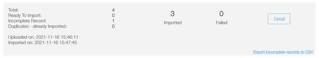 Once the transactions are imported, you will have a report of the transactions that were fully imported and the ones that had an incomplete record or had a duplicate transaction.