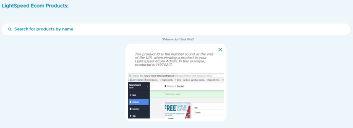- Once you click the Product button, it will show you all the products available. If you have multiple integrations, make sure to choose the products under the LightSpeed Ecom Products section. In case you couldn't find the products on the display directly, you can search via the name or ID in the search bar.