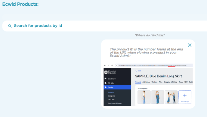 - Once you click the Product button, it will show you all the products available. If you have multiple integrations, make sure to choose the products under the Ecwid section. In case you couldn't find the products on the display directly, you can search via the ID in the search bar.
